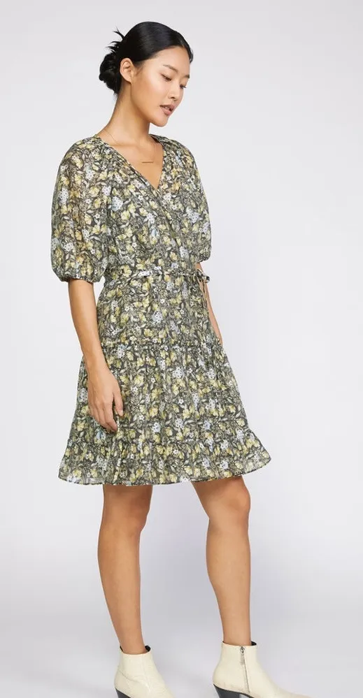 Current air BAROQUE FLORAL WRAP DRESS | Small New with tags This tiered wrap dress is in full bloom, decorated with a pretty floral print on a black base. Featuring puffed sleeves and a flattering tie waist, it's perfect for taking you into the warmer months. •Wrap style - can be worn as a duster •Adjustable waist tie •Short sleeves •Tiered skirt •Ruffle trim