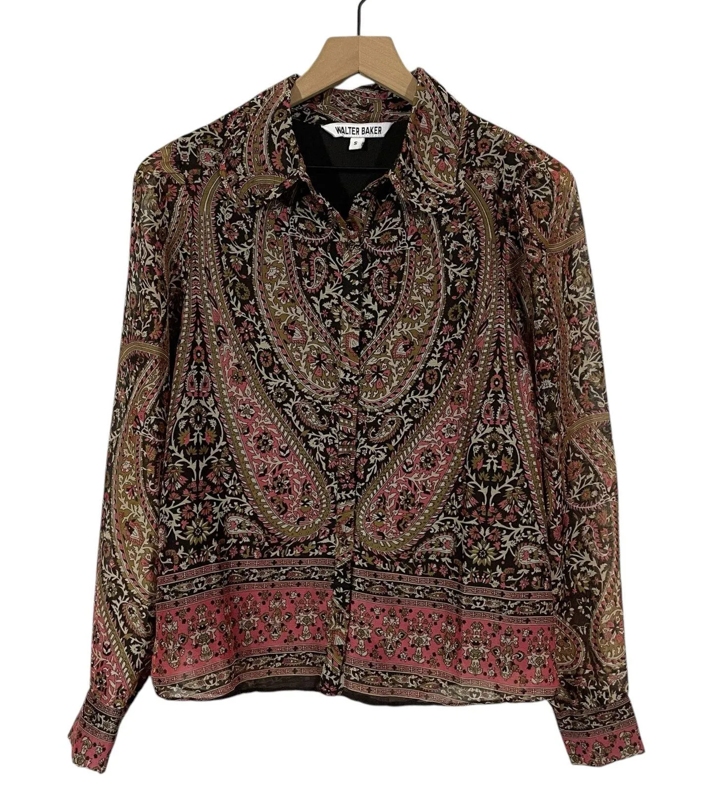 Walter Baker Adaline Paisley Print Shirt Look effortlessly stylish in this casual paisley print shirt. - Size: Small - Color: Brown Multi - Spread collar - Long sleeves - Banded cuffs - Button front - Lined - Polyester - Machine wash - Imported - Stock photos are shown for fit purposes only. - Please review photos as they are apart of the description. - Preowned Condition. No known flaws/minimal pilling/fading. - See photos for approximate measurements - No Modeling/Holds/Trades Please use offer button to negotiate. Thanks!