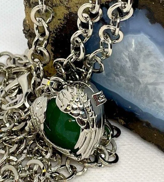 This winged heart shaped necklace cage is made of aventurine, known for its deep, lush green color and semi-precious quality. The heart opens, allowing the aventurine stone to be visible at all times. The 36” chain shows off this neck piece perfectly.