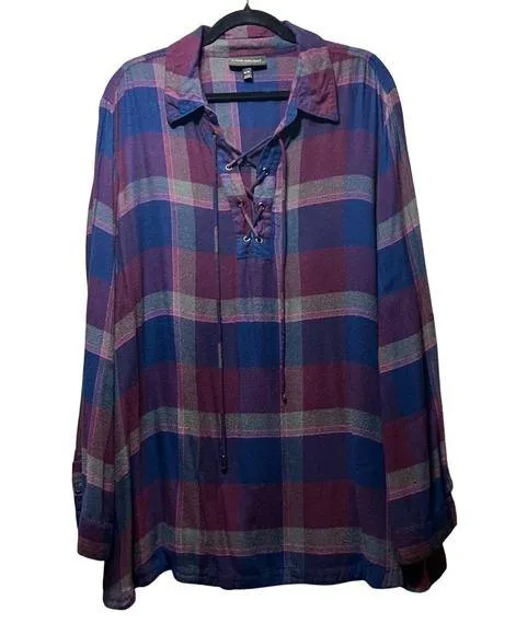Plaid flannel shirt featuring a lace-up neckline and long sleeves with buttoned cuffs. This top offe... Show more