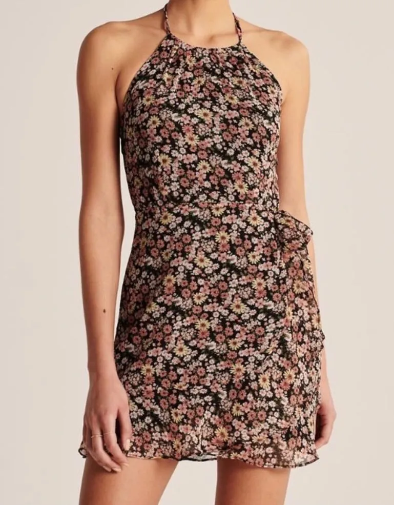 Size small ruffle hem halter neck, wrap dress with back zipper closure. Worn once
