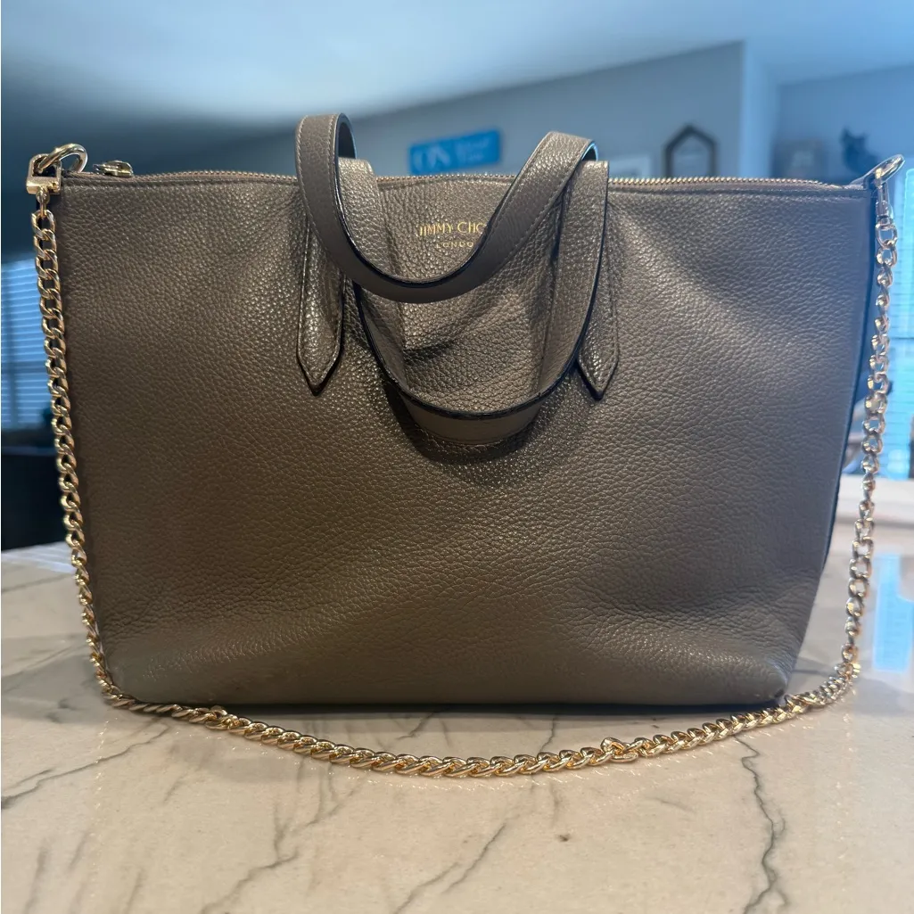 Chic grey/taupe leather tote by Jimmy Choo. Features a stylish gold chain strap (unbranded). Perfect... Show more