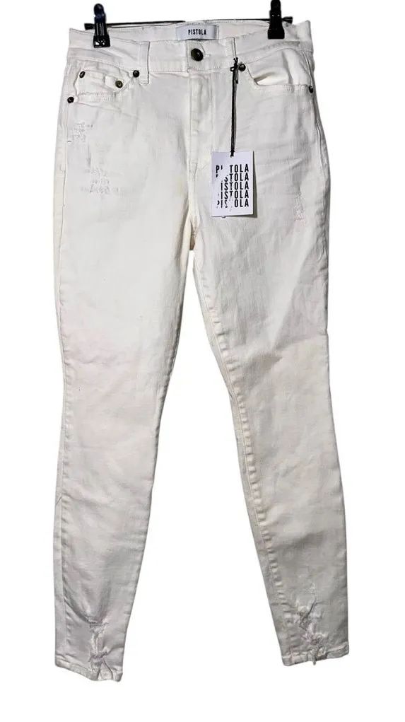 Amazing pair of cream-colored jeans! Very light distressing on legs and pockets for added flair. Size 27. NWT. There is some dirt above the pocket with the tag. I'm guessing it is pallet dust and very well may come out when washed.