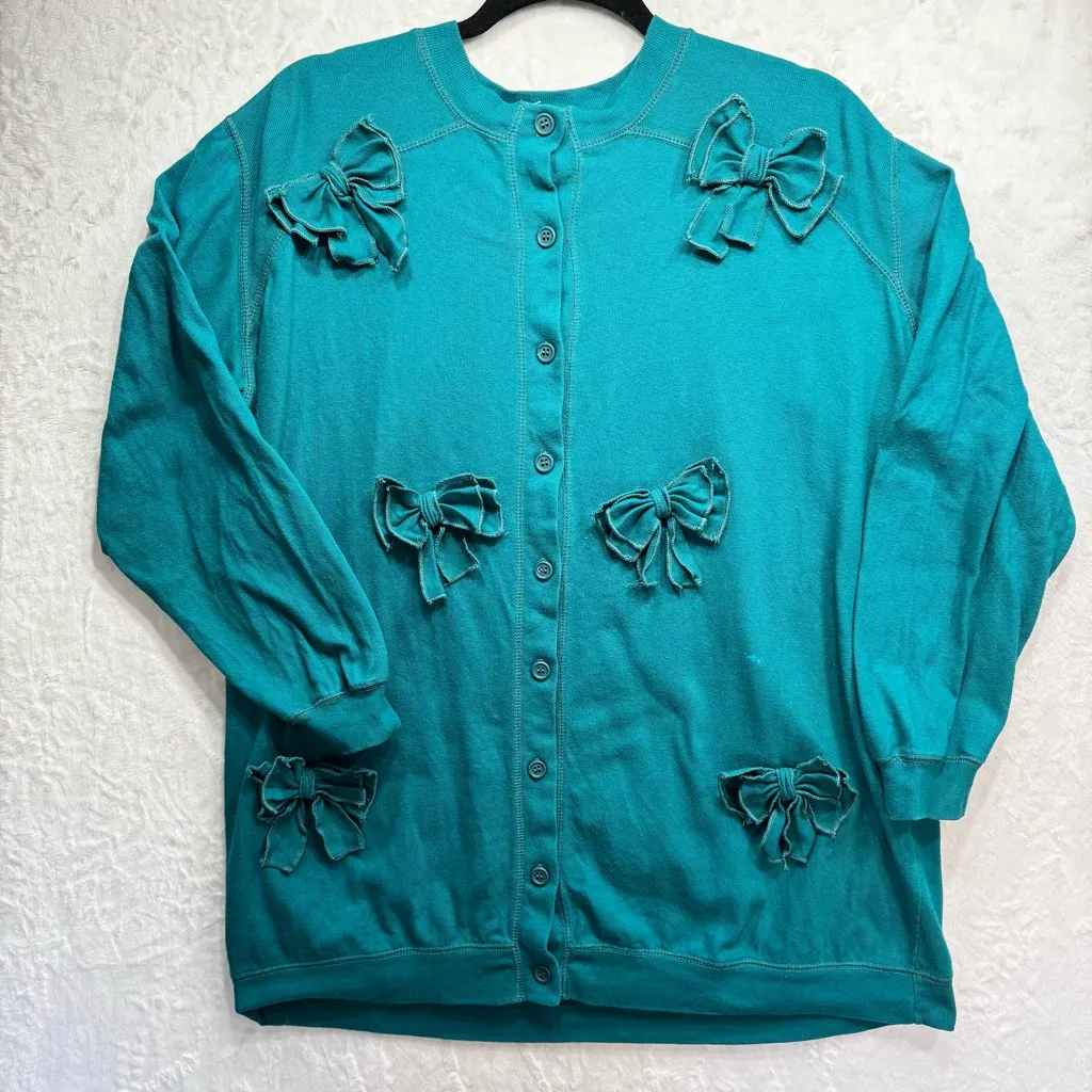 A Pea In The Pod Maternity Vintage Turquoise Teal Cardigan Top. Adorable 3-D Bows all over the front. Soft and comfy 100% Cotton knit. Plenty of stretch and room to grow! Button front. Whipstitched seams. Made in the USA. Women’s size XL, by measurements. No size tag. Very good condition. Small bleach spot, otherwise excellent-see picture. Clean, smoke free home and studio. Five star seller. Super fast shipping! Measurements 23” armpit to armpit 30” length *measurements are approximate SKU# 251093 H32