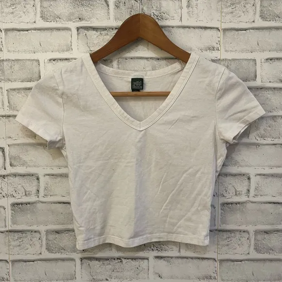 Women’s. Wild Fable. White t-shirt. Short sleeved. Crop top fit. V-neck. Preowned condition. No stai... Show more