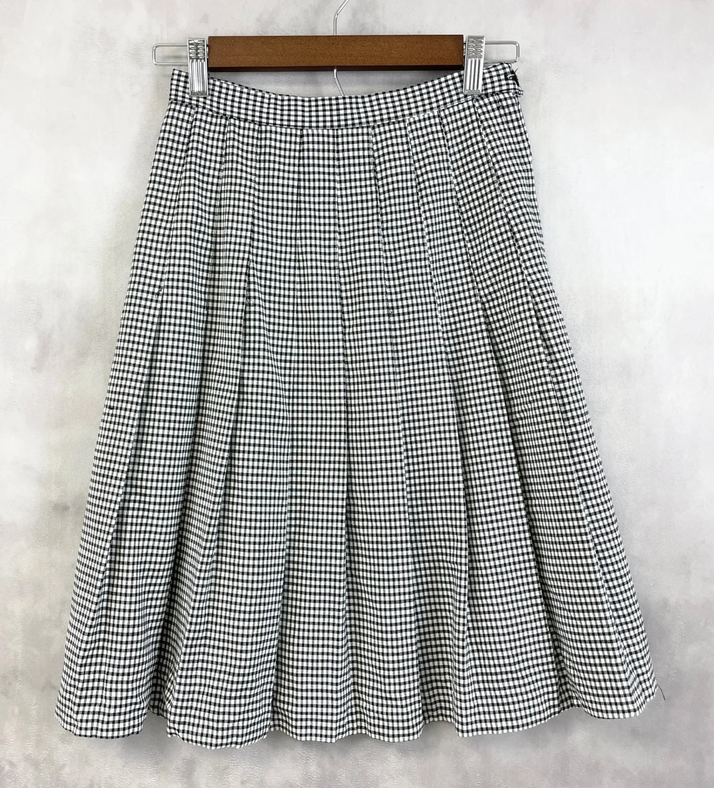 Condition: Very good preowned- no size or material tag Style Aesthetic: Classic, Cottage, Academia, Retro, Minimalist, Preppy, Office, Smart Casual, Parisian, Teacher, Old Money, Timeless, Modest, 90s, Structured, Elegant, Heritage, Quiet Luxury Material: No material tag Color/Pattern: Black and white gingham check pattern Features: Pleated A line midi silhouette, side zip closure with hook, woven fabric, unlined construction, no stretch Size: Estimated size XS/S based on flat measurements (waist 12 in hip 21 in length 23 in hem 32 in) Please see photos for measurements. To ensure proper fit please compare flat lay measurements of a current well-fitting garment All items are second hand / vintage unless stated otherwise, minor signs of wear and small marks may be present. Any major flaws will be pictured and described. 13681