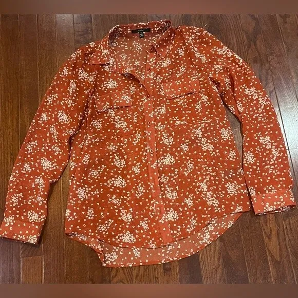 Long sleeve rust heart print sheer button down top size medium Orange - $15 - From Upstyle