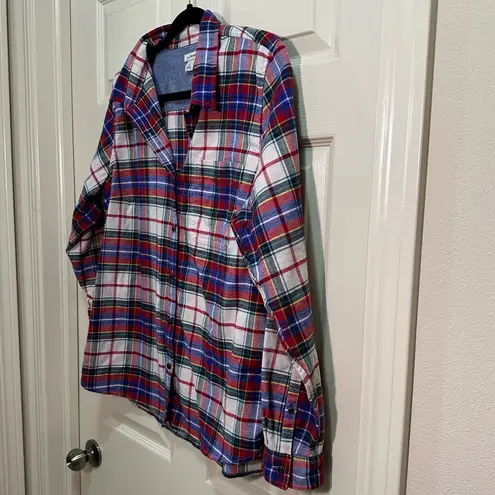 L.L. Bean button down flannel shirt. Long sleeve with button closure at the wrists. Single pocket on the left chest. Multicolor plaid with reds, blues, and greens. Size large. 59% cotton, 39% polyester, 2% elastane.