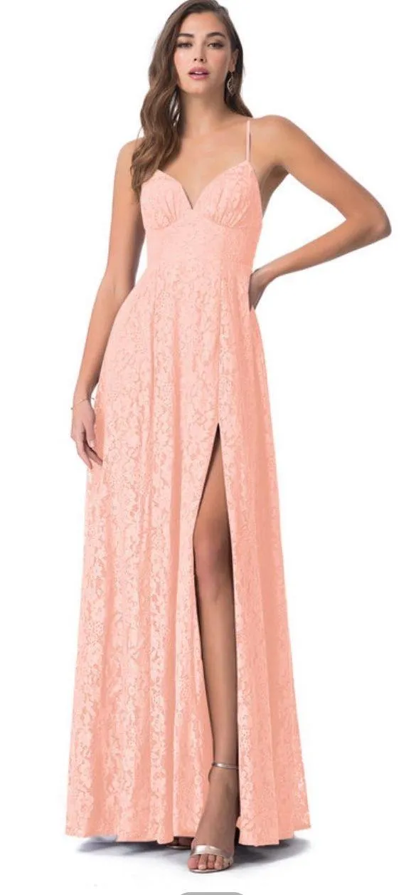 Size A14, I did hem the bottom for my height, 5’4. It was still a little too long. Hem can be cut. Bottom got a little wear as it was an outside wedding with a wood dance floor. Bust: 41 waist: 34 3/4 hips: 44.5 hollow to hem: 61 (note above) If anymore photos are needed please feel free to ask! Hopefully someone else can save some cash on a bridesmaid dress! 😊 I will ship in protective bag that came with the dress.