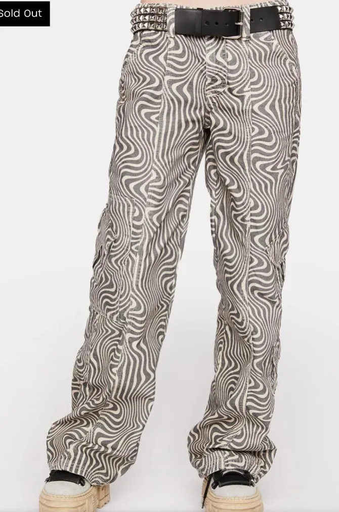 Bold cargo pants with a striking dark but faded navy blue and white pattern. Ideal for a retro, edgy... Show more