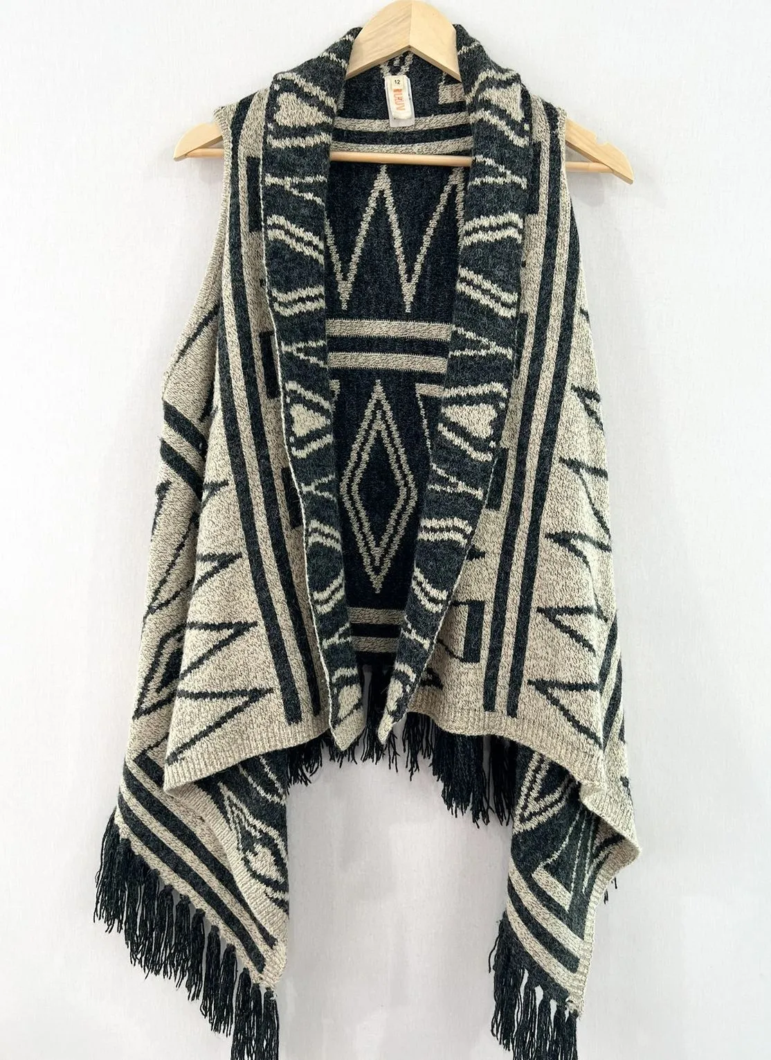 Truluv Aztec Western Knit Fringe Cardigan Vest sz Juniors 12 Boho Southwestern Size Girls 12, equivalent to a women's Medium -boho southwestern knit -fringe -sleeveless -open waterfall front pit to pit: approx 20" when laid flat length: 21", front extends to 39" Ships Next Business Day!