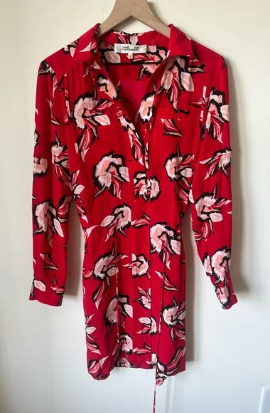 Introducing a stunning DIANE VON FURSTENBERG Silk Taya Shirt Dress in a beautiful red floral pattern... Show more