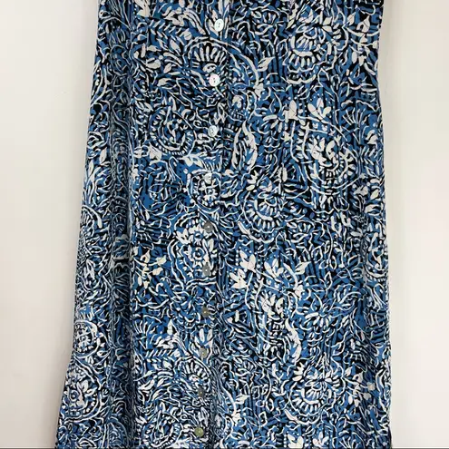 Maggy London Maxi Dress Sz 4 100% Silk Blue Black White Floral boho print Sleeveless Mother of pearl buttons Button front Side slits at hem Adjustable tie back for a fitted look Preowned sold as is Missing 3rd button down Approx Measurements Laying Flat Pit to pit- 17” Length- 53.5” Boho Bohemian Western Chic Trendy Blogger Spring Summer Cottagecore Lagenlook Peasant Babydoll