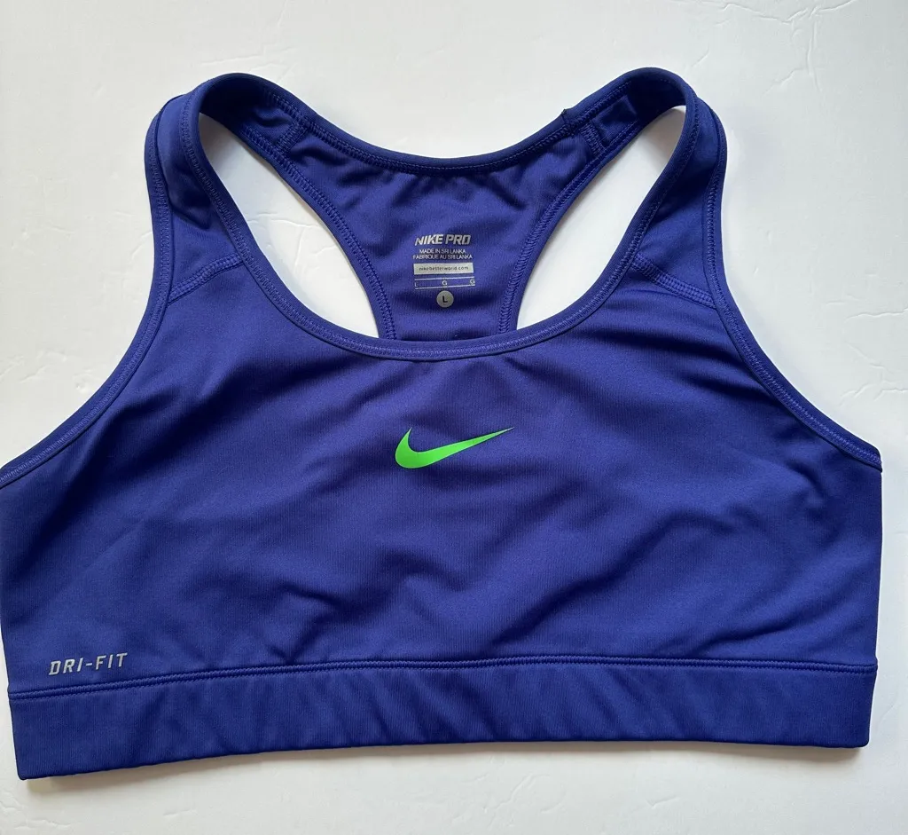 Experience comfort with the Nike Dri-FIT sports bra. Features a royal blue base with a lime logo acc... Show more
