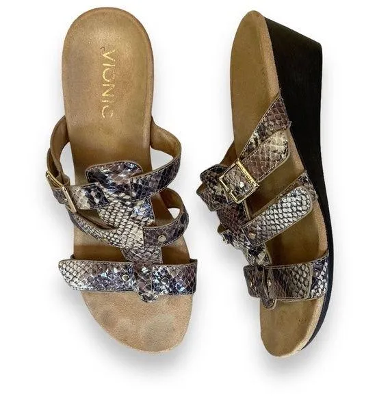 Vionic Radia snake skin print wedge sandals. Three adjustable straps--top buckle and 2 lower velcro. Snake skin textured print has hues of browns with gold buckle and accents. Size is NOT marked on the shoe but the shoe measures to be the same as other 7.5 sized shoes it was grouped with. Excellent used condition with no visible flaws.