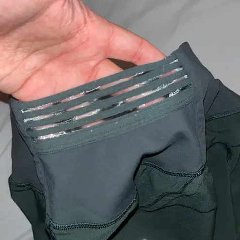 dark green lululemon shorts, I don’t know the style but they’re unlined and have cute little mesh pa... Show more