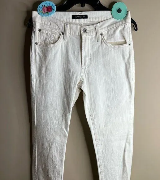 James Jeans off white pearl color size 28/32 straight leg 98% cotton 2% spandex 14”- waist across back 8.5”- front rise 33”- inseam 7.5”- leg opening Excellent condition- no signs of wear or flaws
