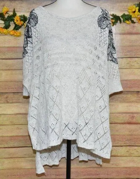 This Anthropologie Knitted & Knotted poncho sweater features intricate embroidery and crochet detail... Show more