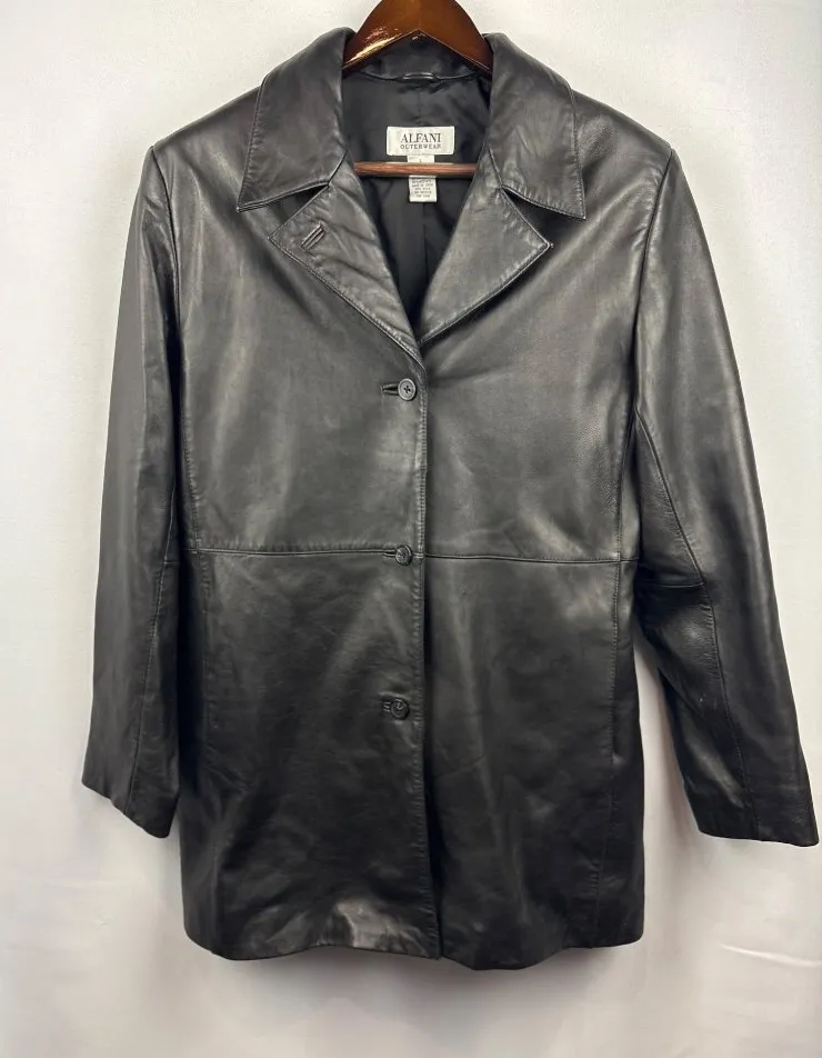 This women’s Alfani Outerwear leather jacket is perfect for cold weather. It’s very stylish and chic. Made from genuine leather it’ll keep you warm and comfortable. It has buttons on the sleeves and is a size large. Measurements Length 33” Pit to pit 21” Sleeve 25” Size: Womens Large Condition: Pre-Owned Like New
