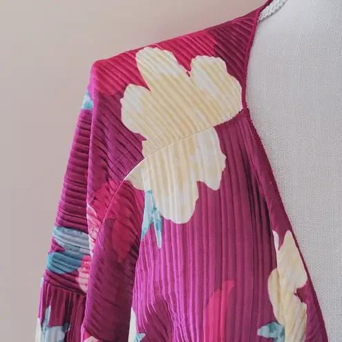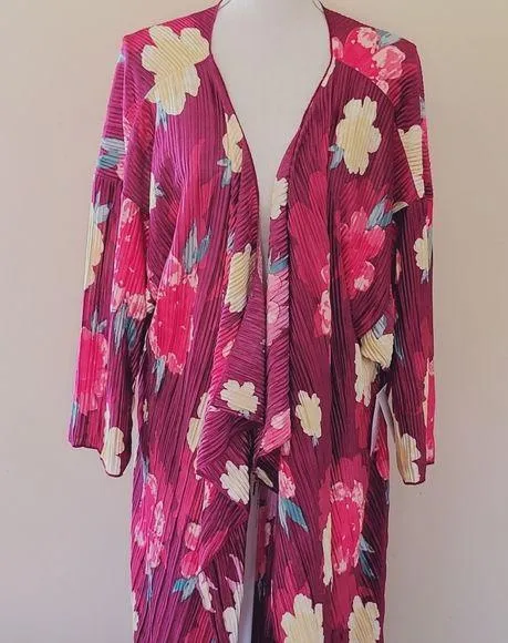 Ethereal burgundy satin floral flowing angel sleeve long duster kimono size large 100% polyester D... Show more