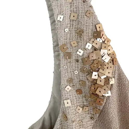 . Never worn. Still have tags that were cut off. Tan/hood sheath dress with pleated detail. Sleeveless. Sequin embellishments at shoulders. V-neck in front and back. Zips in back. Polyester. Approx. Measurements Chest 16.5" across pit to pit. Waist 14" across laying flat. Length 37" V6 Women’s, sleeveless, metallic, shiny, sequins, cocktail party, event