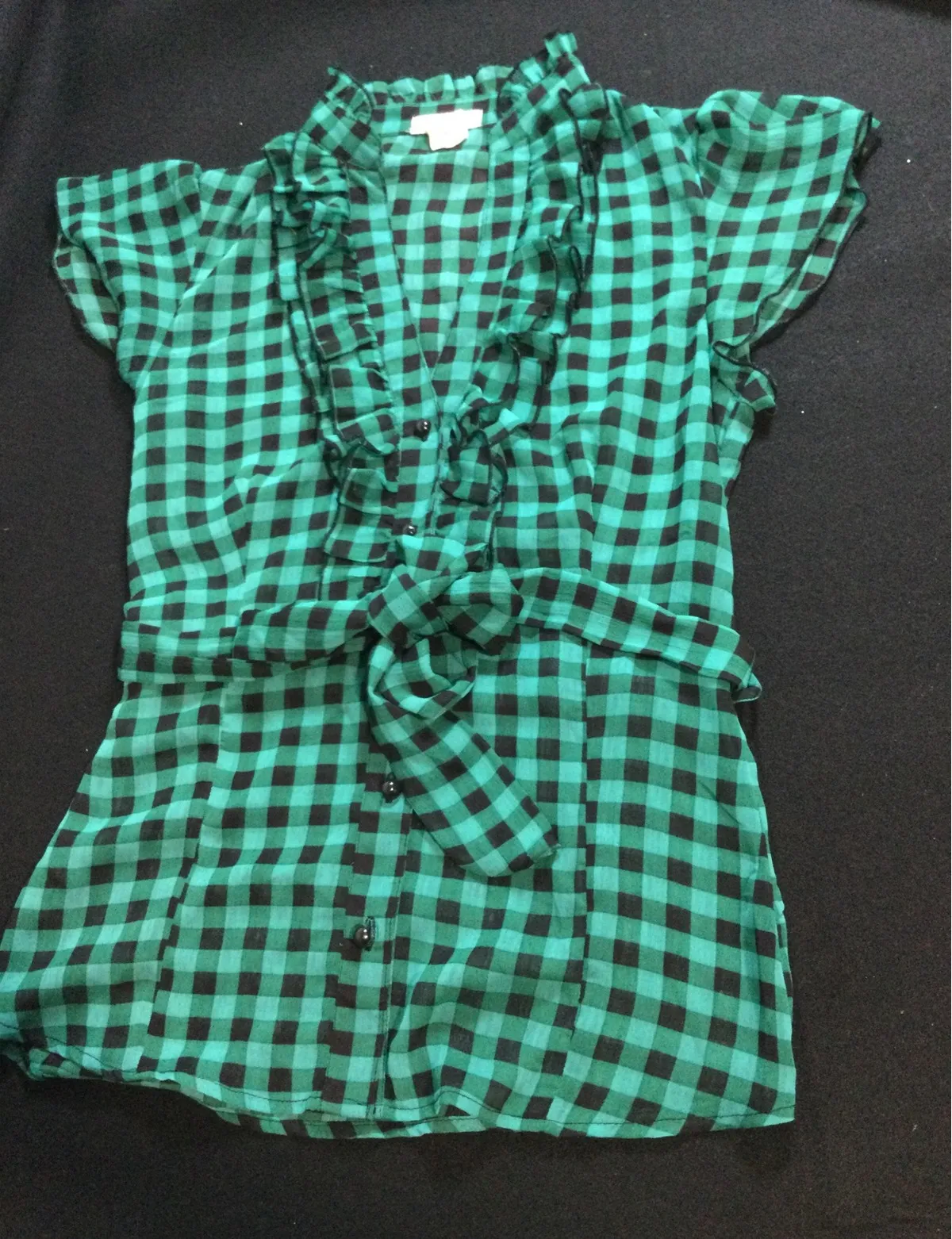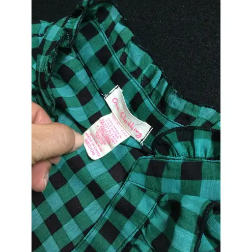 Strike a playful yet polished tone with this charming green plaid blouse. It features a flattering v... Show more