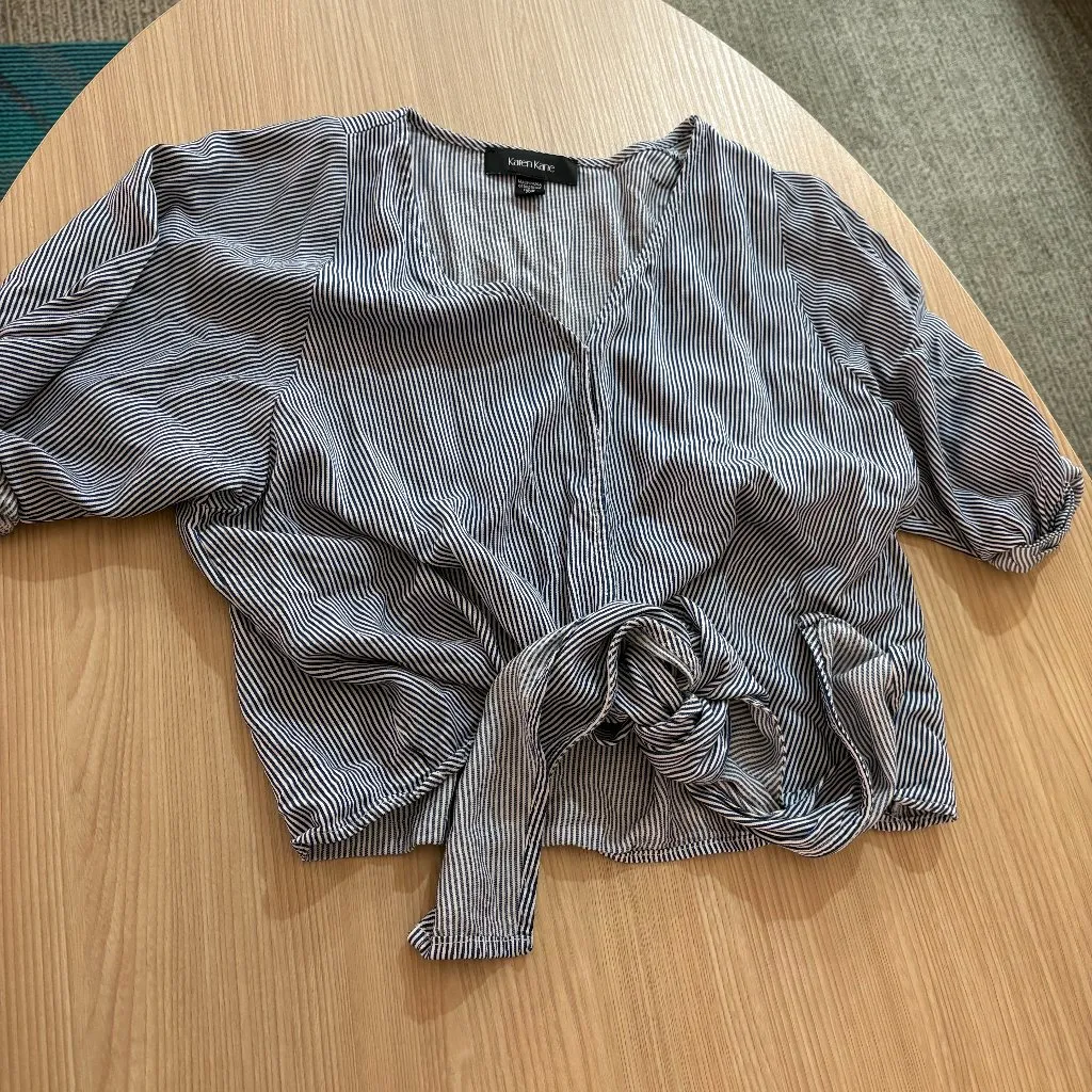 Karen Kane Short Sleeve Blouse XS Xtra Small Blue White Striped Snap Tie Rayon - $13 - From Mary