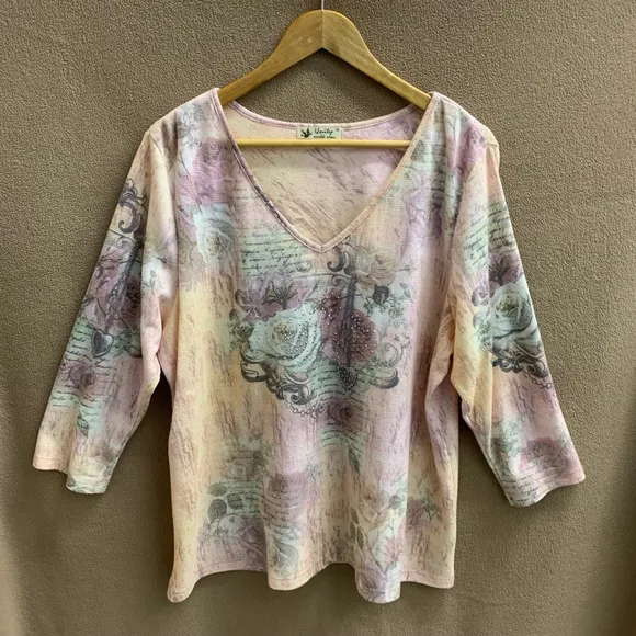 Pre-owned Unity World Wear women's 3/4 sleeve blouse, size 1X. Features a V-neck, floral and script... Show more