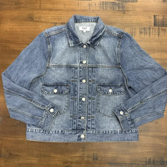 The OAT New York Denim Jean Jacket is a classic wardrobe staple for women. Made from 100% cotton denim, this boxy jacket in size large features a button closure and long sleeves. The timeless blue color and basic jacket style make it versatile for pairing with any outfit. Easy to care for with machine washable fabric, this jacket is a durable and stylish addition to any closet. Perfect for layering in the cooler months, this denim jacket from OAT New York is a must-have for any fashion-savvy woman. Measurements Pit to pit 22" Top to bottom 22.5" Sleeve length 25" 100% Cotton Excellent condition