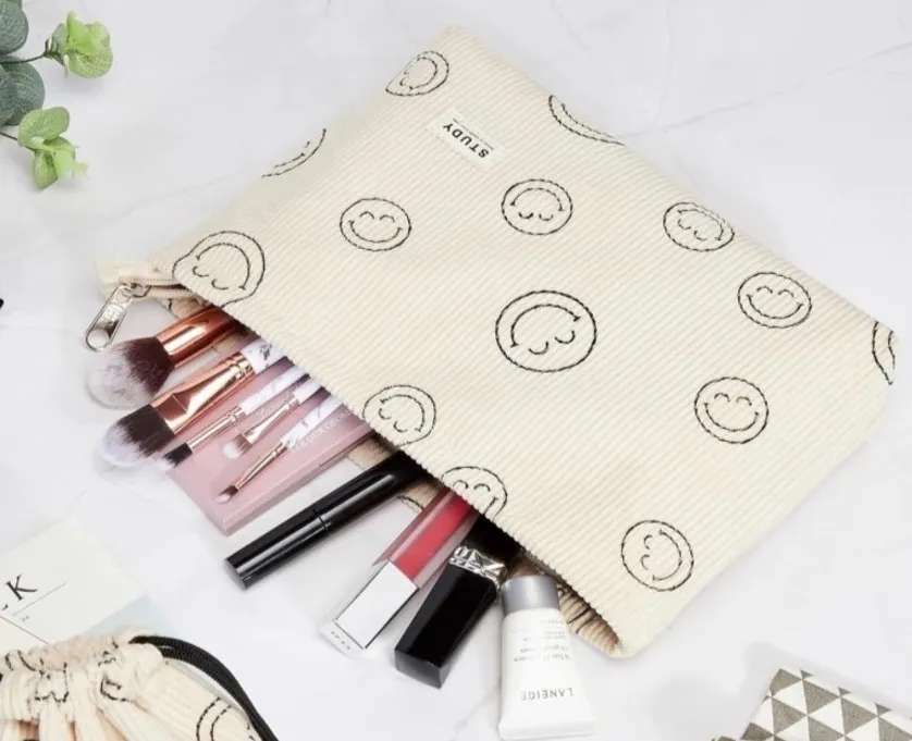 HOST PICK! How stinkin’ adorable are these travel / makeup bags?! 🤩🤩🤩 Soft corduroy design in ivory cream with black smiley faces! You’ll get TWO bags in this listing: 1) Large zippered pouch with waterproof lining, and 2) Matching drawstring pouch (not lined) Use as travel toiletry bags, makeup / cosmetic bags, pencil case, vitamins, charger cords for your tech…anything that needs organizing! NWOT (wrapped + sealed) Size: ~12 x 8 in (zip bag), ~7 x 6 in (pouch) Measurements: see pics, if avail Note: New in bag, removed only for pics/video. Pet/smoke-free home.