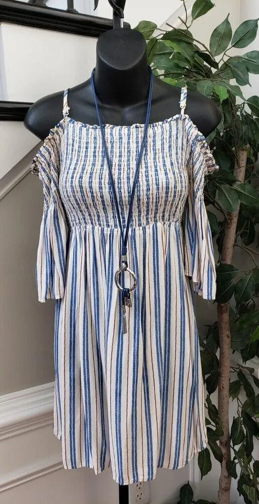 Description Magnolia Skye Women Multi Striped Smocked Cold Shoulder Sleeve Mini Dress Size S. Prod... Show more