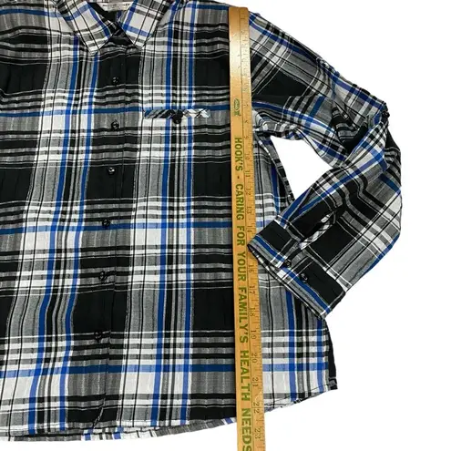 Elevate your wardrobe with this stunning Allison Daley women's shirt in a beautiful black plaid pattern. This long-sleeved button-up shirt features a collared neckline and roll tab sleeves, perfect for any occasion. Made with a blend of 51% cotton, 47% polyester, 1% metallic, and 1% spandex, this shirt is both comfortable and stylish. The shirt is machine washable and features button accents, making it easy to wear and care for. Ideal for petites, this shirt is a size 10P and is perfect for any woman looking for a basic yet stylish addition to her wardrobe. Made in Indonesia, this shirt is a must-have for any fashion-conscious woman.