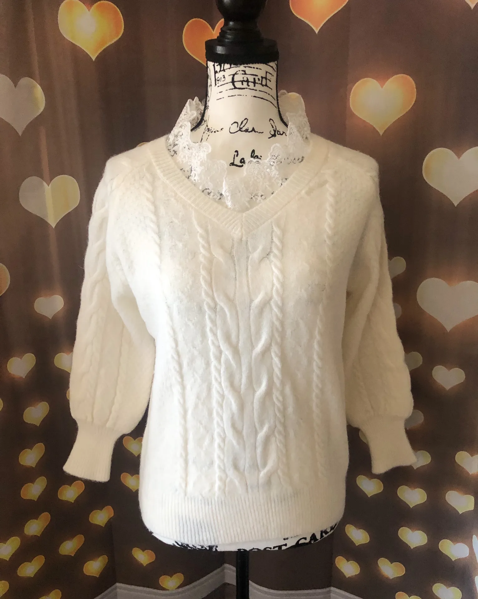 Beautiful cable knit sweater Sleeve length is more at the wrist. Not long ♦️True to size sweater. But please note size order will be true to size. This listing is for the creamy white sweater. Green is available in my shop ♣️The lace is attached to the collar of the sweater Comfortable and chic