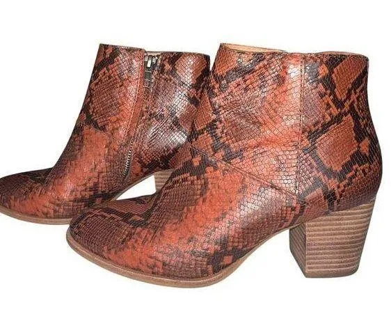 The Madewell Rosie Boot is a red snake-embossed leather ankle bootie with a round toe and zip closur... Show more