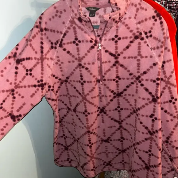Stylish pink pullover with a unique geometric pattern. Features a convenient quarter-zip design.