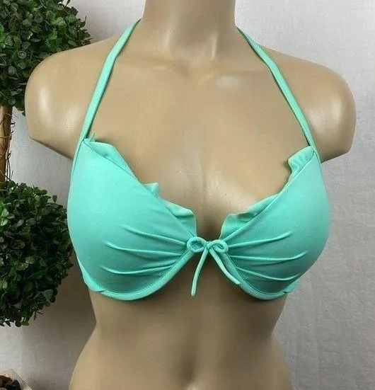 Very good pre owned No flaws noted Underwire Padded contour cups Adjustable neck & back tie close