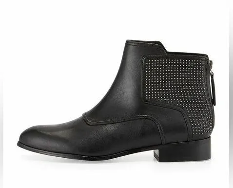Womens Pour La Victoire Keon Short Back Studded Booties, Black, Size 7.5 • Brand: Pour La Victoire • Heel: 1.00 inches (2.54 CM) • Material: Leather • Color: Black • Toe-Shape: Round Toe • The boot shaft measures approximately 3.50 inches (8.89 CM) tall and has an opening of 9.00 inches (22.86 CM). • Flaws highlighted in the photos. Easily fixable with shoe polish.