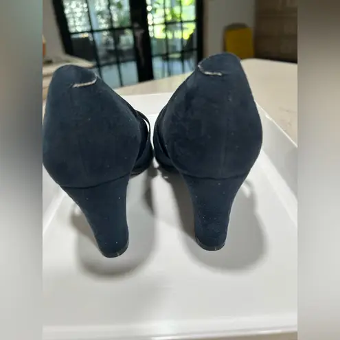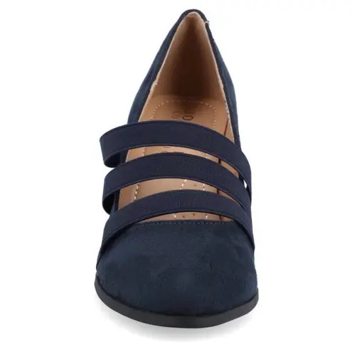 Blue NO BOX Looking for a vintage-style pump with a fresh look? The Loren by Journee Collection is the perfect shoe for you. These classic pumps feature soft vegan suede uppers, topped with triple elastic strap details that'll make you stand out from the rest. With comfort insoles and a narrow-width footbed, these shoes will provide a comfortable fit that's perfect for all-day wear. Add the Loren to your wardrobe and enjoy its timeless style and modern updates. Upper Material: Faux Suede • Toe style: Round • Heel Height: 2 3/4 • Closure type: Pull-on • Shoe Width: Narrow