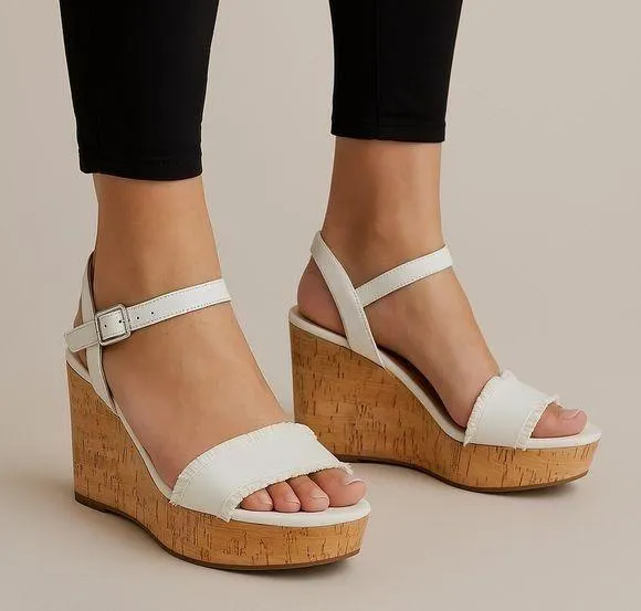 Kate Spade White Ruffled Leather Tomas Cork Platform Wedge size 8.5 in very good condition - some s... Show more