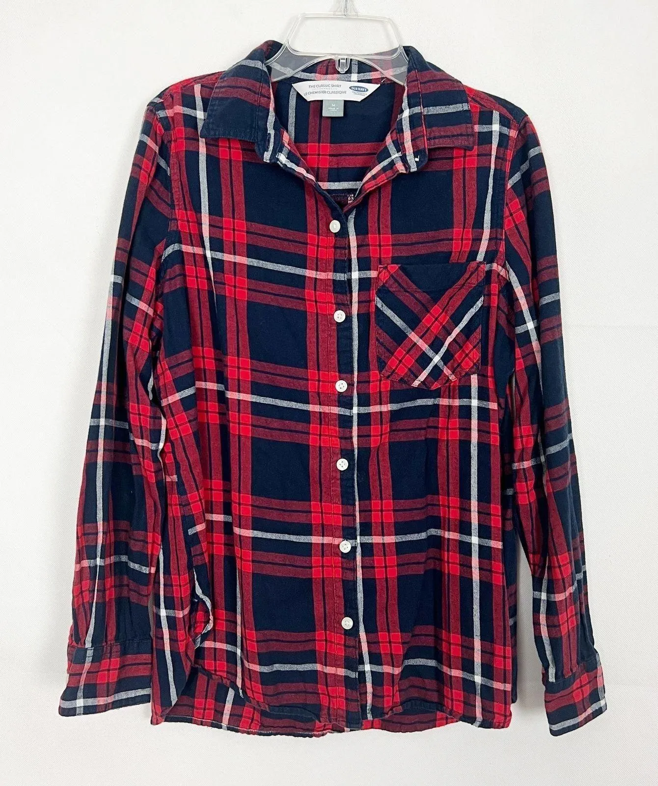 Old Navy women's plaid shirt in white, red, and navy blue. Collared. V-neck. Button down. Long sleev... Show more
