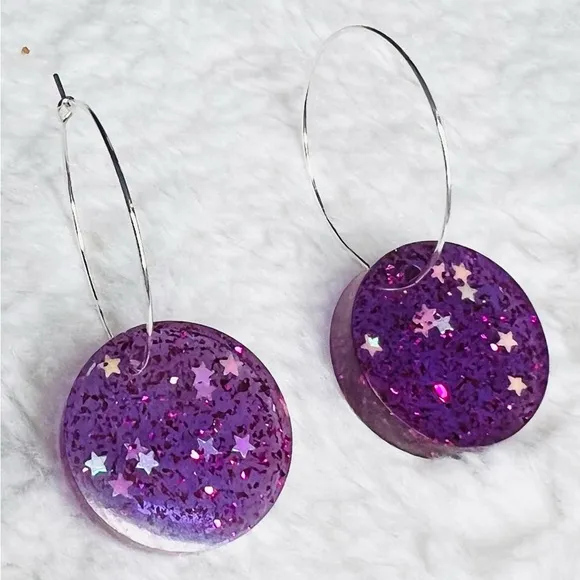 Handmade one of a kind pair of Purple Galaxy Glitter Resin Pendant Hoop Earrings! Featuring vibrant sparking purple fuchsia glitter and iridescent white stars, these fun Statement earrings shimmer as they catch the light! The hand crafted pendants hang from silver toned single clasp hoops, giving them a cool floating effect! Wear these to add a fun pop of color and personality to any outfit! Lightweight and comfortable to wear! Custom colors available to match any outfit for any occasion! Perfect for Bachelorette parties and birthday party favors! Going out party festival costume jewelry wedding guest cosplay theme party fancy dressy rave festie gear dolls kill vibes artisan small business fun funky retro 90’s vintage look gift for her treat yourself edm concert cute femme feminine flirty drag bold colorful glittery sequins
