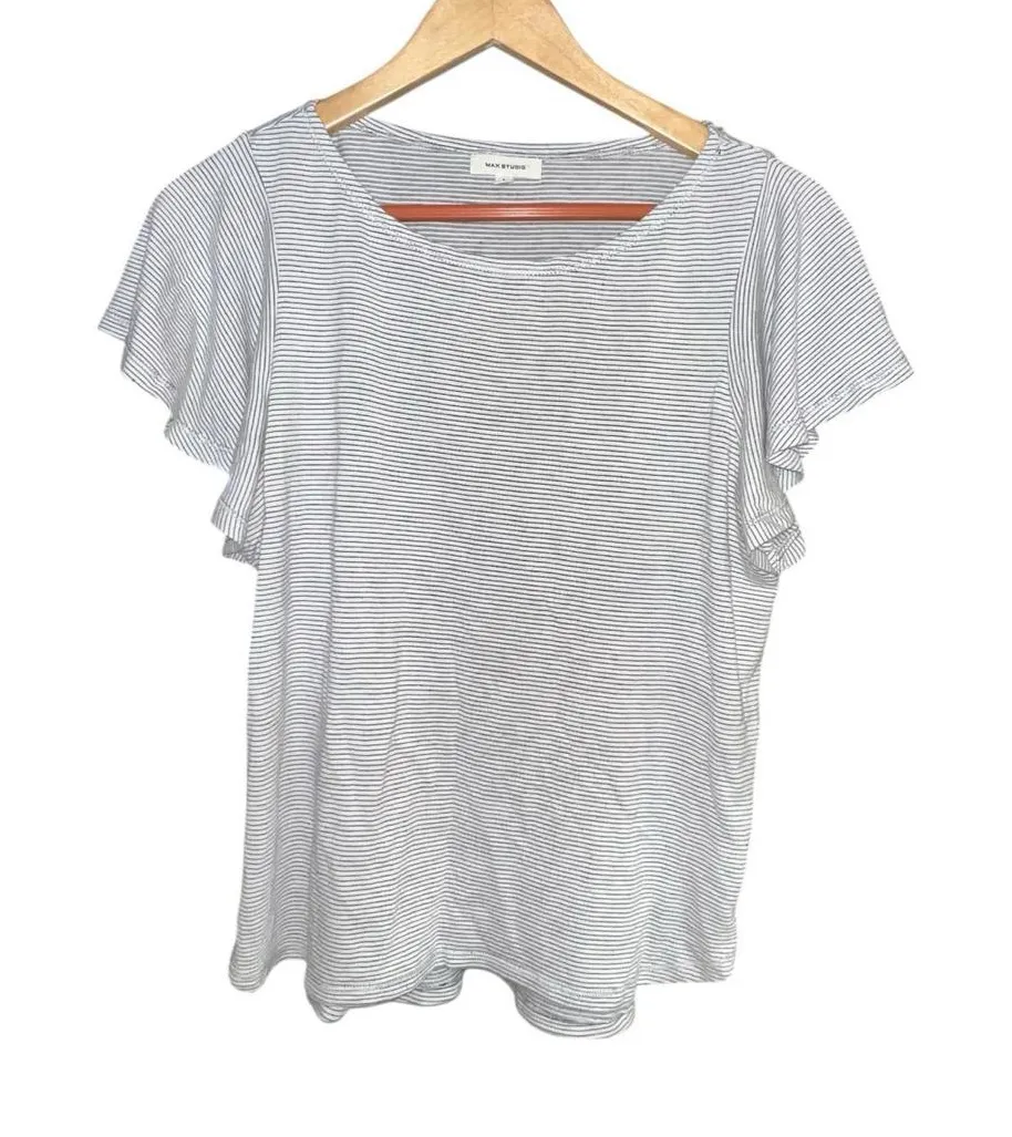 Soft and lightweight Max Studio striped top featuring a scoop neckline, flutter ruffle sleeves, and... Show more