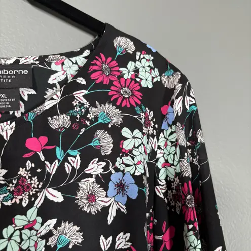 Women's petite boho top by Liz Claiborne Career. This black top has a white, pink, and blue floral... Show more