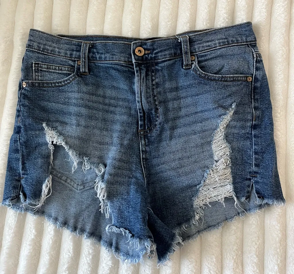 Trendy distressed jean shorts. Classic blue hue. Perfect for casual wear. Size 9/29 Kendall and Ky... Show more