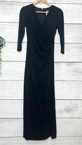 Tadashi Shoji Vintage Black Ruched Long Sleeve Evening Gown Women’s Size Petite Small This stunning black dress by Tadashi Shoji features a chic faux wrap design with elegant ruching at the waist, perfect for black tie events and special occasions. The flattering V neckline and 3/4 sleeves add a touch of sophistication, making it an ideal choice for cocktail occasions. Think old Hollywood glamour! Approximate flat lay measurements: Pit to pit: 16 inches Waist: 13 inches Hips: 18 inches Length from shoulder to hem: 55 inches