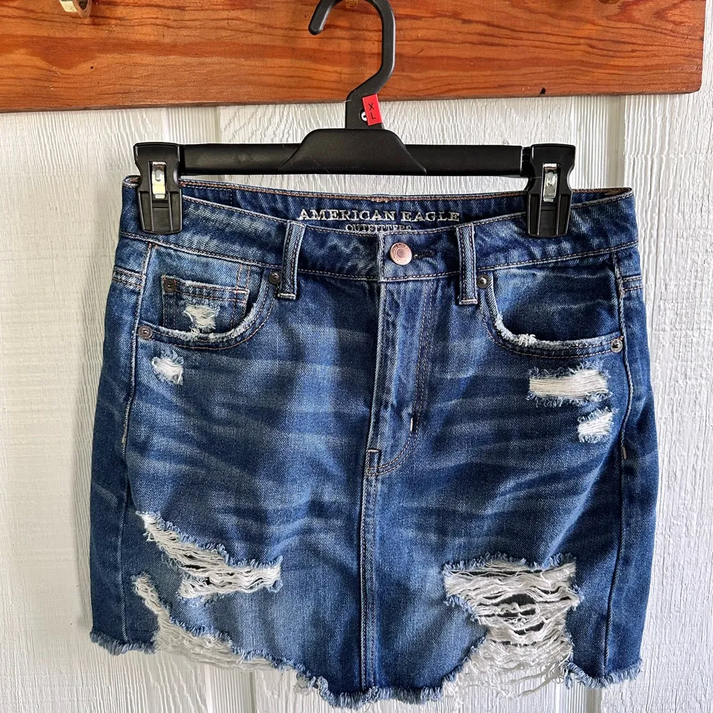 . Stylish distressed denim skirt. Perfect for casual outings. Features ripped details for a trendy l... Show more