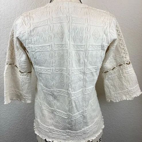 Micaela Ivory Patterned Boho V Neck 3/4 Sleeve Sweater V Neck with Crocheted Lace Sleeves With Leather Tie Weaved Thru Sleeves Rolled End of Sleeves & Hem No Snags, Stains or Holes 100% Cotton Pit to Pit: 19” Length: 20.5” Size Large