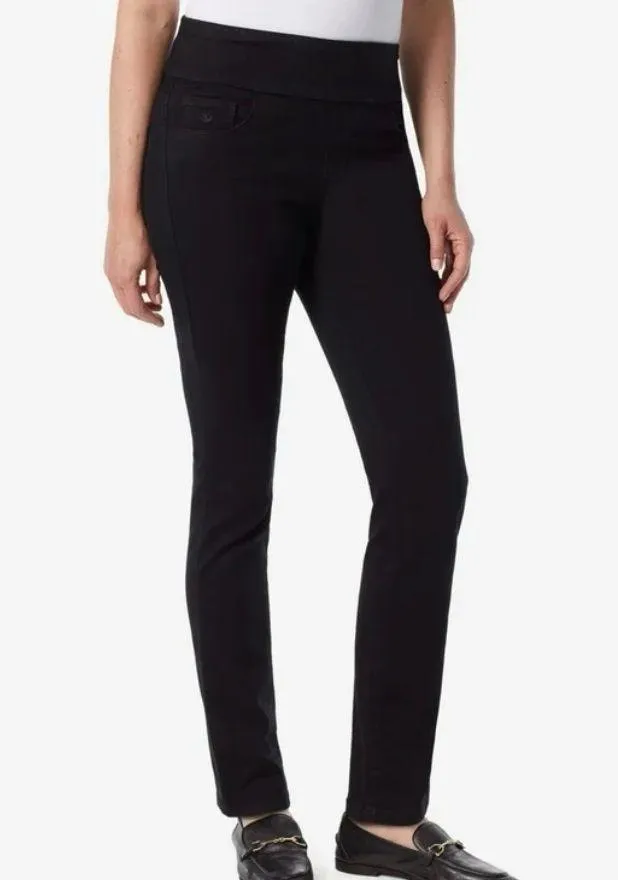 Gloria Vanderbilt Black Amanda Pull-On Jeans Size: 14 Long Classic black jeans with a comfortable pull-on design. Versatile and chic. Upgrade your essentials wardrobe with these women's pull-on jeans from Gloria Vanderbilt. Elastic Waistband 5 pockets Straight hem Unlined C9