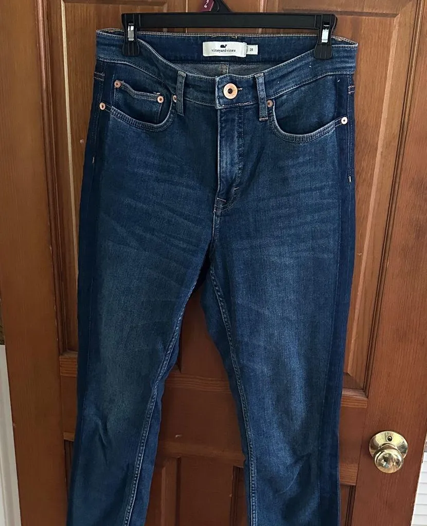 High waisted VV jeans, worn 2-3 times. Excellent condition, dark wash jeans with darker wash stripe... Show more