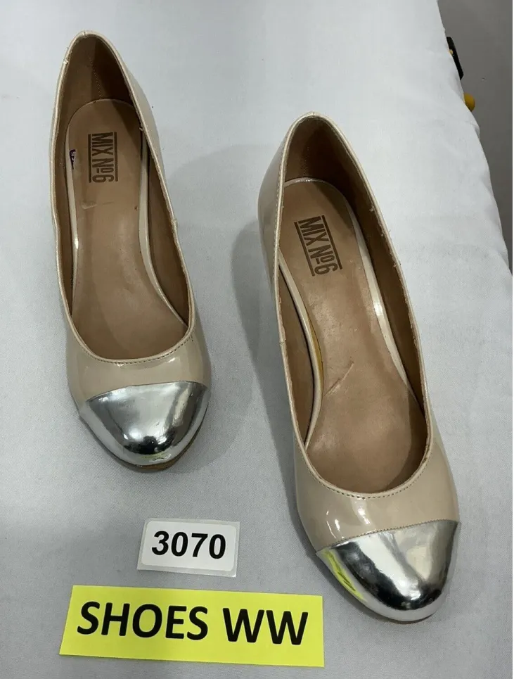 Elevate your style with these Mix No 6 slip-on pumps. The beige color and silver toe accent add a touch of elegance to any outfit. The 3” high heel height is perfect for a night out or a formal occasion. These pumps are made with synthetic upper material, ensuring durability and longevity. The slip-on closure makes them easy to wear and the size 10 fit perfect for women. These shoes are brand new without the box (NWOT) and ready to be added to your collection. Dress up or down with these versatile Mix No 6 M-briel pumps.